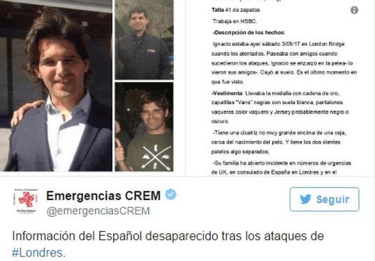 La propia familia ha publicado en una red social que Ignacio Echeverría, vecino de Las Rozas, estaba en el puente de Londres en el momento del ataque y continúan sin tener noticias suyas desde el sábado por la noche.