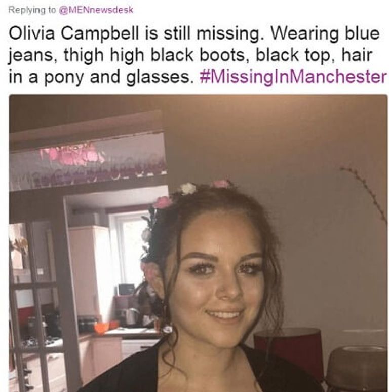 La chica de la foto se llama Olivia Campbell y un amigo cercano es quien ha pedido que se publique la foto. Dice que llevaba pantalones vaqueros y botas negras hasta el muslo. Olivia estaba con su amigo Adam en el concierto y no ha vuelto a saber de ella.